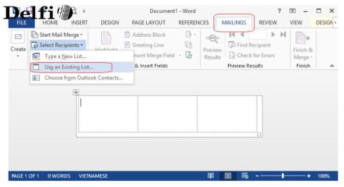 – Mở tab “Mailing” → Chọn “Use an Existing List…”