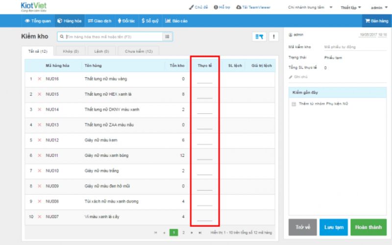 Chọn phần kiểm kê trong kho, bạn chỉ cần kích hoạt tính năng quét mã vạch và tiến hành quét từng mục hàng cần kiểm kê. Đối với các mặt hàng có cùng mã, hệ thống sẽ tự động cập nhật số lượng kiểm kê tương ứng với số lần quét.