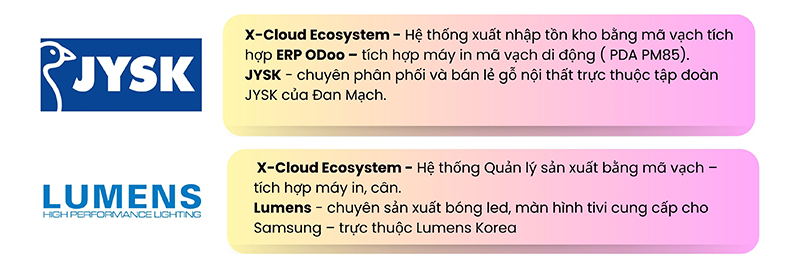 Nhiều doanh nghiệp tại Việt Nam đã sử dụng XCloud để quy trình kiểm kho được nhanh chóng chính xác, giảm chi phí vận hành và tăng hiệu quả sản xuất. Điển hình là các công ty bán lẻ, chuỗi siêu thị và nhà sản xuất quy mô vừa. Đã hoàn toàn chuyển đổi sang phương pháp quản lý hiện đại bằng mã vạch với XCloud.