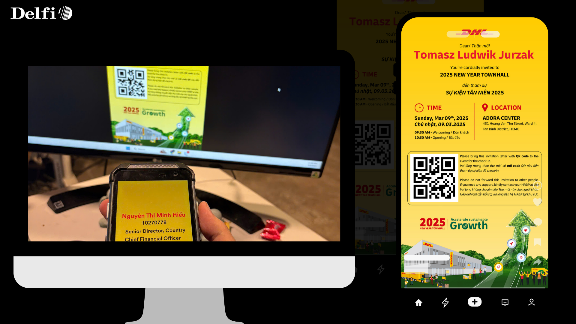Vào ngày 09/03/2025, sự kiện 2025 New Year Townhall do DHL tổ chức đã diễn ra long trọng tại The ADORA Center – TP.HCM, với sự tham gia của hơn 800 Khách mời. Để nâng cao trải nghiệm và tối ưu quy trình tiếp đón, DHL đã tin tưởng lựa chọn gói giải pháp check-in bằng mã vạch của Delfi – một bước tiến hiện đại trong việc quản lý sự kiện chuyên nghiệp.