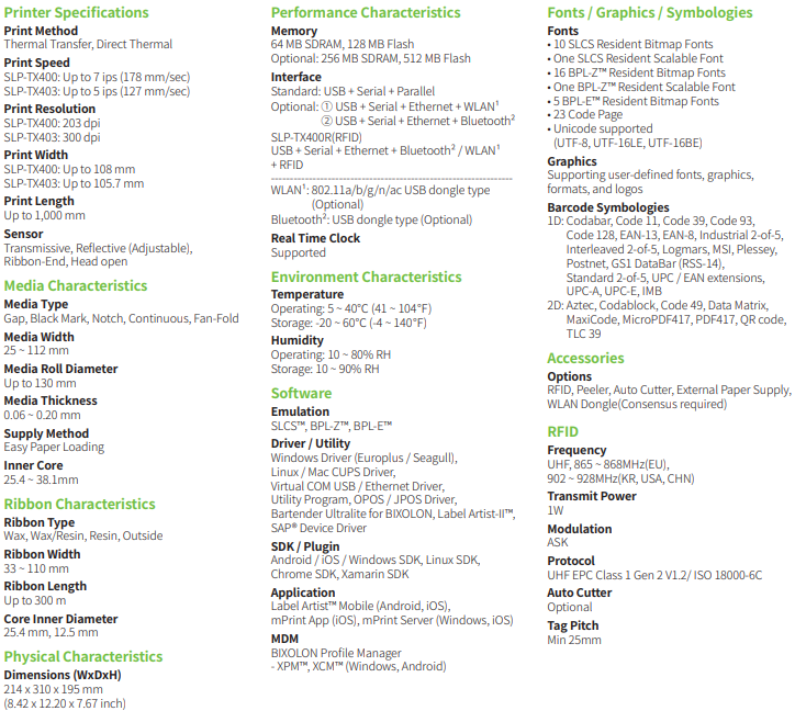 Máy in mã vạch Bixolon T403 là một sản phẩm được sản xuất bởi công ty Bixolon Inc và mang thương hiệu uy tín của họ, Bixolon. Sản phẩm này xuất xứ từ Hàn Quốc và có các thông số kỹ thuật sau:
