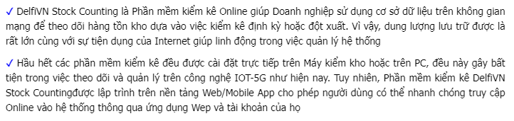 => Phần mềm kiểm kê Online DelfiVN Stock Countingcung cấp các tính năng phần mềm kiểm kê mã vạch toàn diện giúp cho nhân viên của bạn được cập nhật, quản lý chi phí, tiết kiệm thời gian và cung cấp báo cáo chi tiết, tức thời, minh bạch. Giảm thiểu sai sót và rủi ro trong quá trình kiểm soát hàng hóa!
