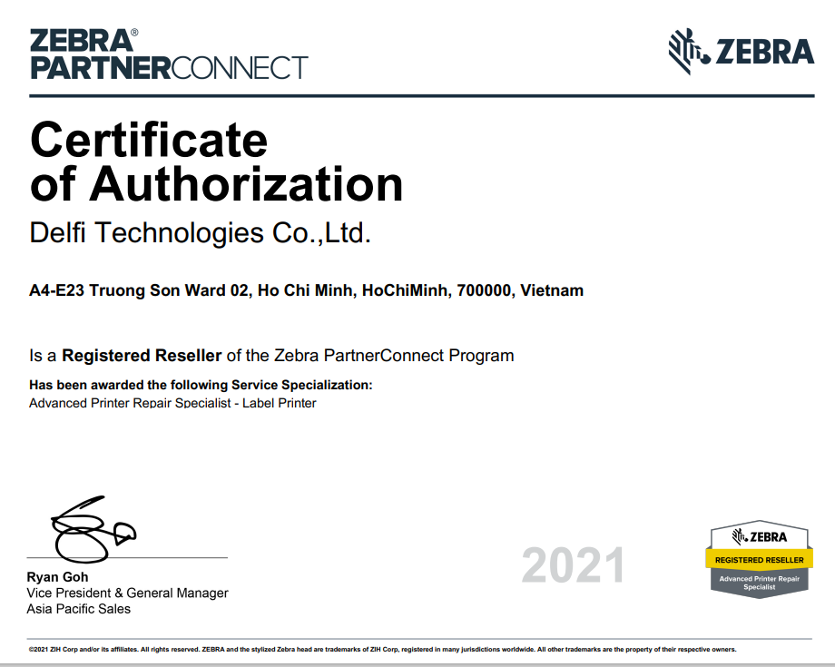 ✔ DELFI là Trung Tâm Kỹ Thuật Thiết Bị Mã Vạch Ủy Quyền được chính Hãng Zebra chỉ định Sửa chữa – Bảo hành tại Việt Nam