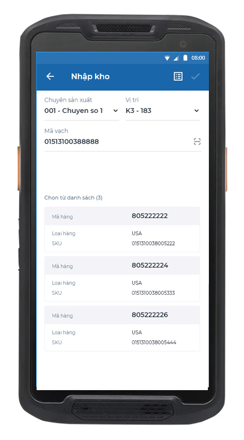 Sử dụng máy quét mã vạch để quét mã và nhập vào hệ thống. Các thông tin cần thiết cần nhập bao gồm: tên sản phẩm, mã hàng, mã vạch, số lượng, ngày nhập, số lô hàng, ngày sản xuất, hạn sử dụng, vị trí lưu trữ… và các thông tin cần thiết khác.